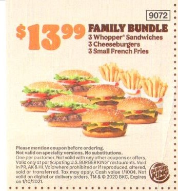 Burger King Family Bundle Coupon - May 2022 Verified ... Burger King Coupon. $13.99 Family Bundle with 3 Whopper Sandwiches, 3 Cheeseburgers, 3 Small French Fries. Use Code: 8639 At participating locations. Not Valid in PR, AK, HI and outside US. Turn Device Sideways to see Wide In-Store Coupon. Show device to store at register. Most coupons are valid only at participating locations and not valid in ... Burger King Family Meal Coupon - TheRescipes.info Burger King Family Bundle Coupon Code January 2022 Best Coupon Codes · 6334 - $12.99 Family Bundle (3 Whoppers, 3 Cheeseburgers, 3 Small Fries) · 9041 - $8.99 Whopper Meal for 2 · 4431 - $5 Whopper Meal ·... Via Morevoucher.com Category : Coupon View More Coupons Burger King Family Meal Coupon - 07/2021 See more result ››