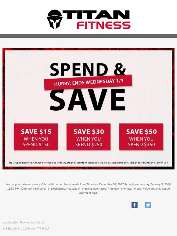 50% Off Titan Fitness Coupon Codes & Promo Codes - Extrabux Cyber Monday Coupon - Titan Fitness: Cyber Monday Sale: Up to 30% Off Sitewide + Double Points: 11-28-18: Christmas Coupon - Christmas Sale: 10% Off Sitewide @Titan Fitness: 12-26-18: One of today's top offer is :Titan Fitness Spend & Save Sale - Spend $350 And Save 10%. Enjoy the up-to-date Titan Fitness promo codes and deals for instant ...